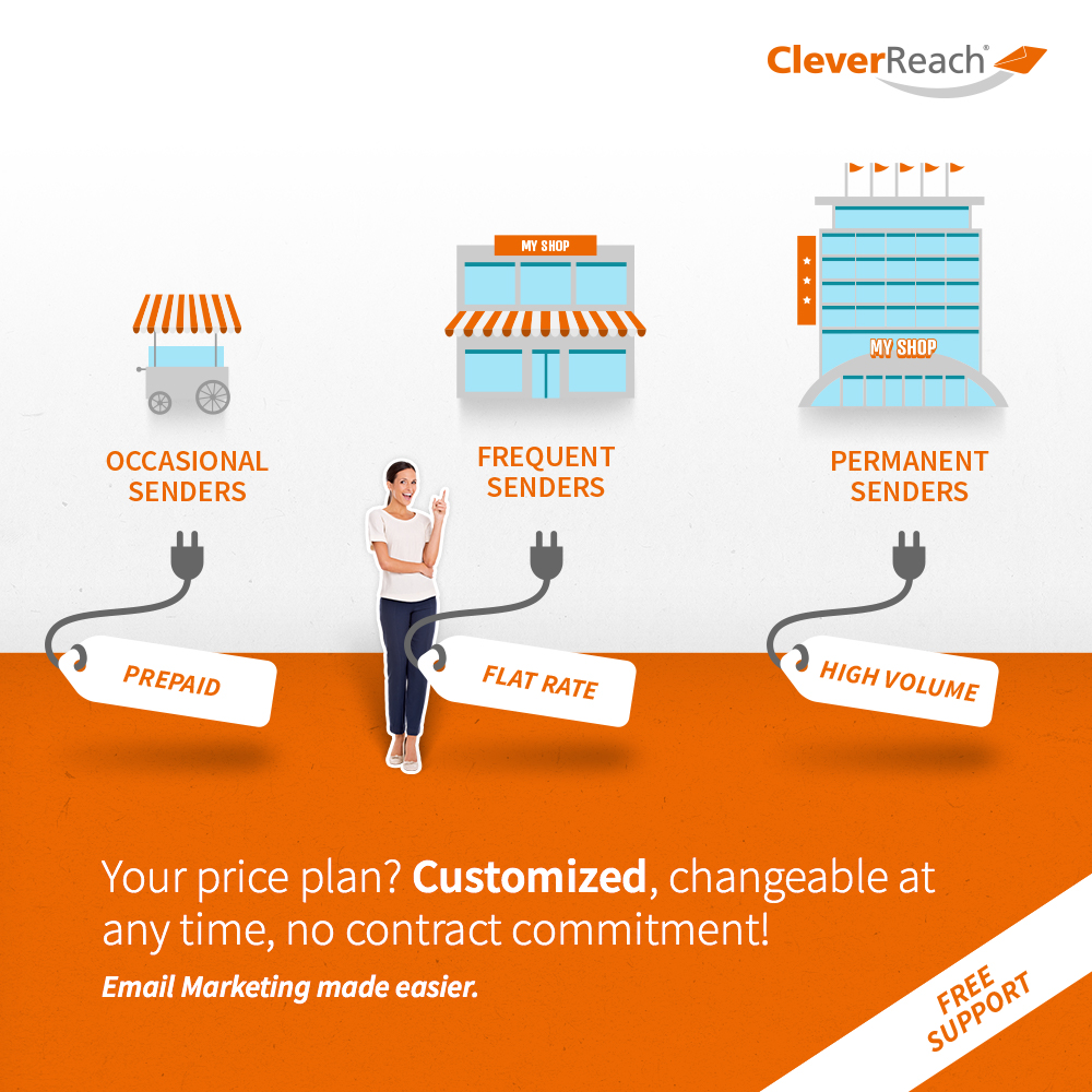 The right pricing for everyone: customized, changeable at any time, no contract term – Scales for small and big contact lists: prepaid for occasional senders, flat rate for regular senders or high volume for big players