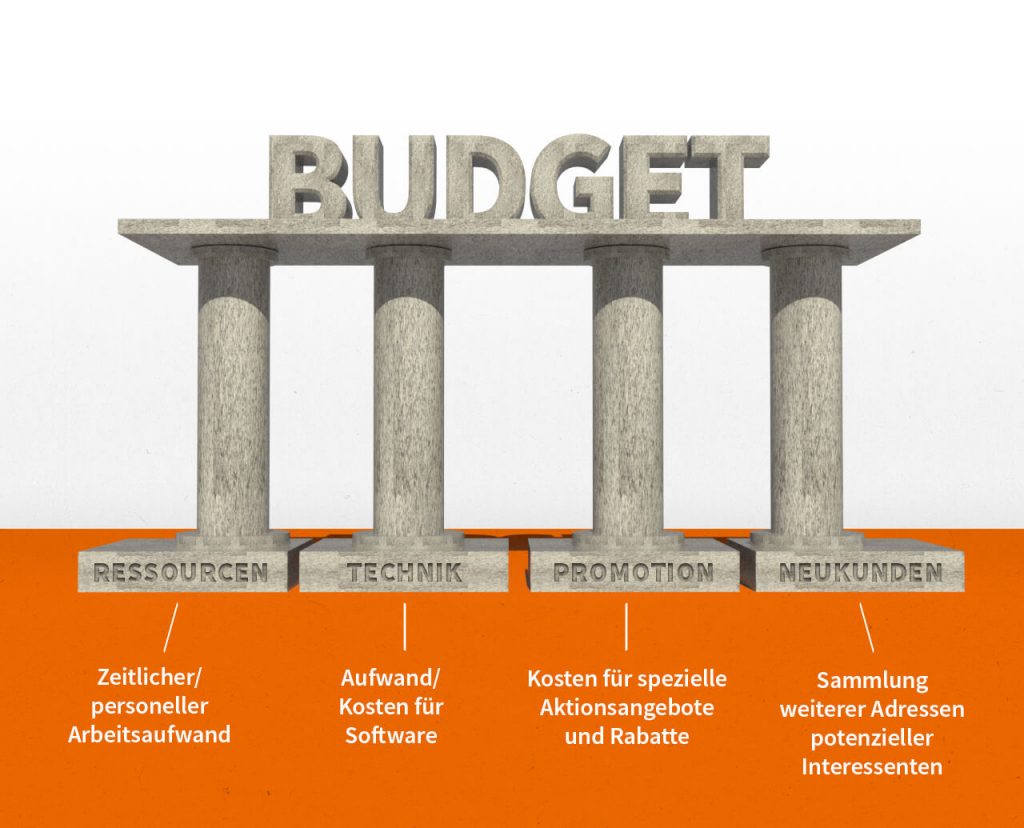 Wenn einige Kennzahlen zu den obigen Punkten formuliert wurden, können Sie an die vorläufige Berechnung des Budgets gehen. Ordnen Sie Ihre Zahlen den folgenden Aufwandskategorien zu, um den idealen Überblick zu bekommen: