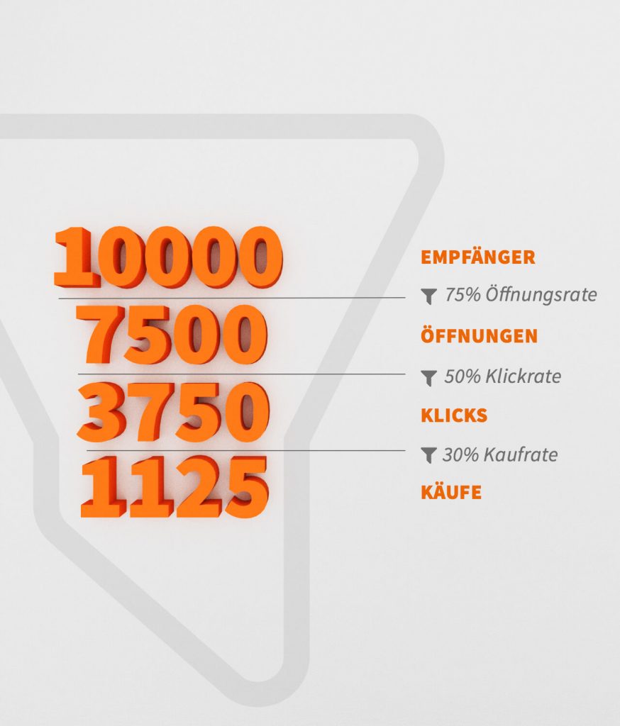 In unserem Beispiel öffnen 75 % der Empfänger den Newsletter. Von diesen 7.500 Empfängern klicken 3.750 bzw. 50% auf den Link in der E-Mail und wechseln dadurch auf die Homepage. Und davon nehmen wiederum 30 % das Angebot wahr und konvertieren, das heißt 1.125 der 10.000 Newsletter-Empfänger kaufen etwas. Dieses Beispiel verdeutlicht, dass die Zahl der Angeschriebenen um ein Vielfaches höher ist, als die Zahl derjenigen, die am Ende wirklich konvertieren (also beispielsweise etwas kaufen).